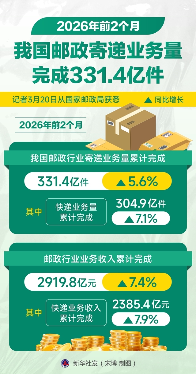 记者3月20日从国家邮政局获悉,今年前2个月,我国邮政行业寄递业务量累计完成331.4亿件,同比增长5.6%。其中,快递业务量累计完成304.9亿件,同比增长7.1%。