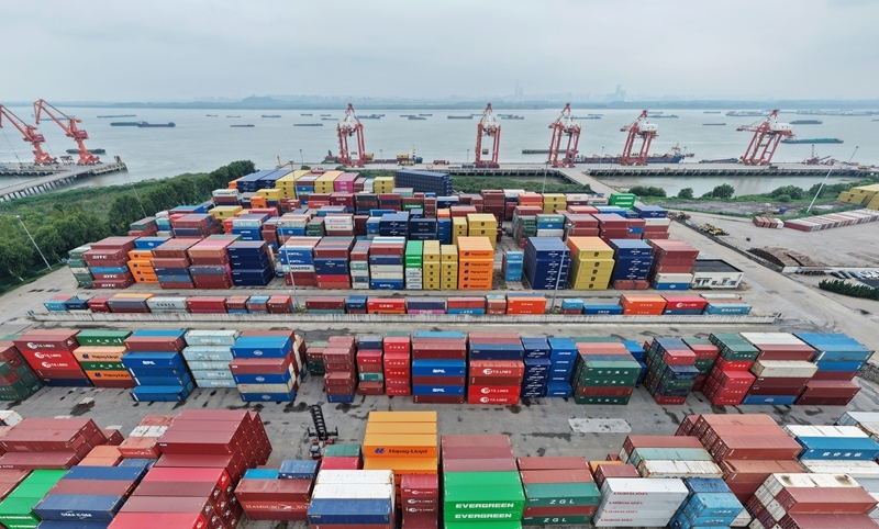 9月8日,在山东港口集团青岛港,一艘装载外贸集装箱的货轮驶离泊位(无人机照片)。