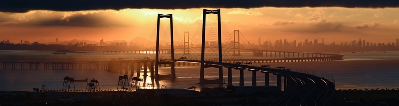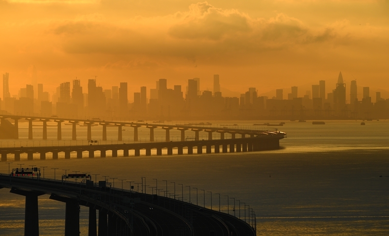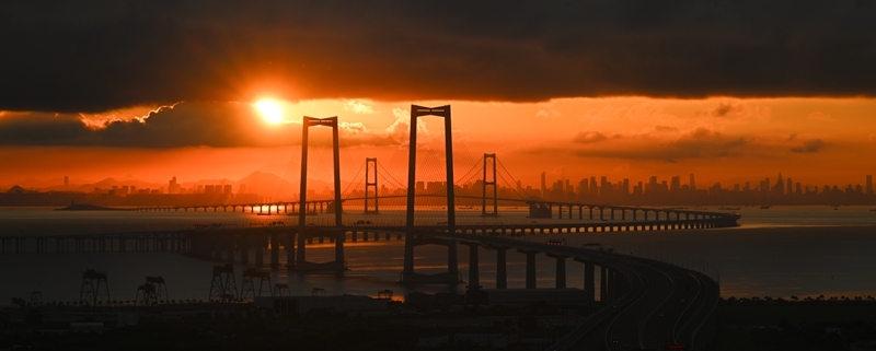 9月14日拍摄的沐浴在晨曦之中的深中通道与远处的深圳市区。