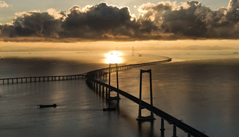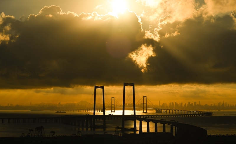 珠江口伶仃洋上,深中通道沐浴在晨曦之中,长虹卧波、美不胜收。