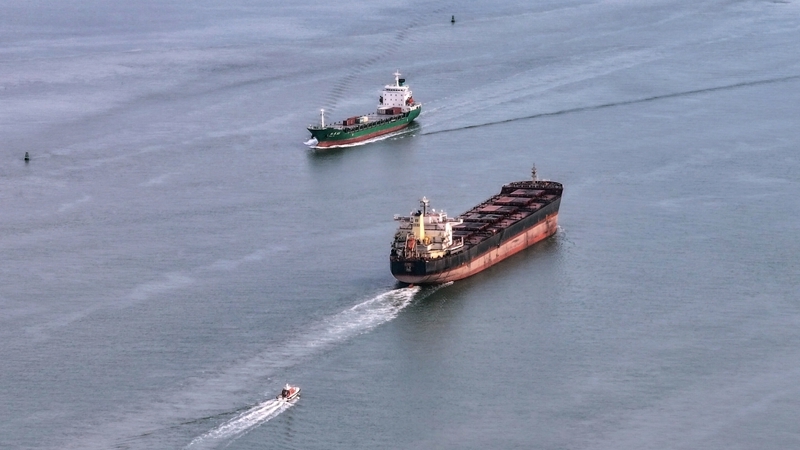 这是一艘海轮驶离钦州港(9月16日摄,无人机照片)。