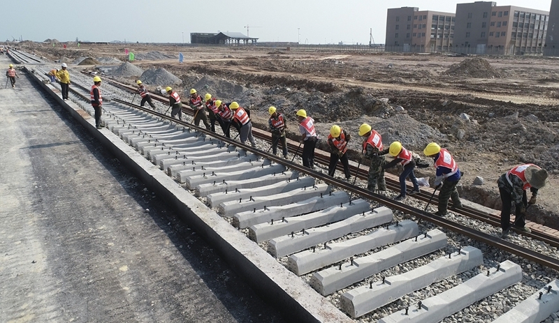 这是钦州港东站扩建工程钢轨铺设现场(2019年6月27日摄)。