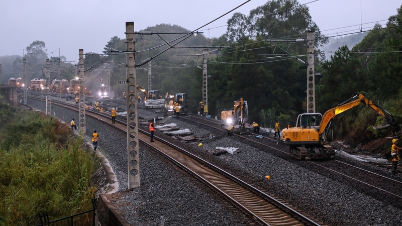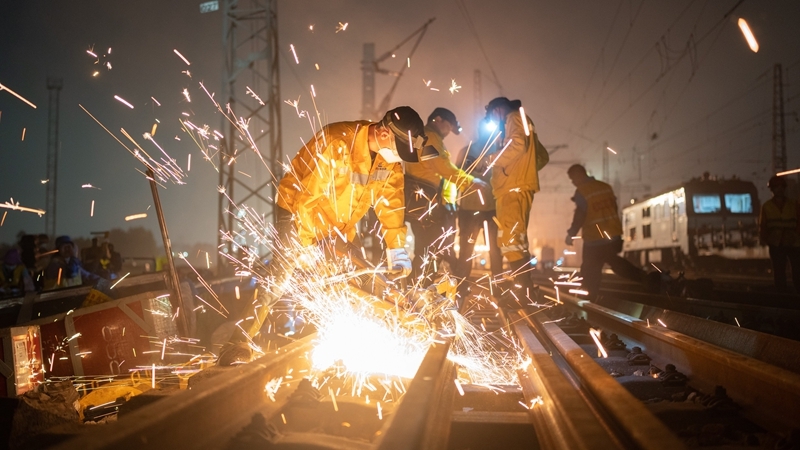 这是铁路工人在给西部陆海新通道更换轨道(2021年9月2日摄)。